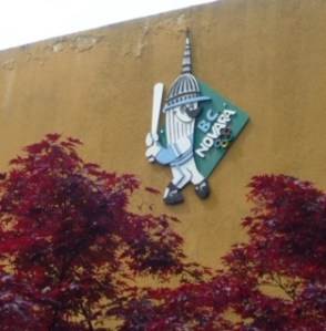 Bozzetto del numero unico 1972, con l’abbraccio di baseball e softball che caratterizza Novara.