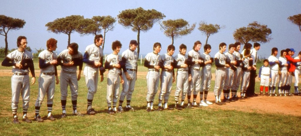 L’esordio in serie B, ad Anzio, vede il Novara (al saluto iniziale nella foto sopra) cimentarsi per la prima volta nei “doppi incontri”: Franco Zulian è il catcher in entrambi, in batteria con Gigi Faccio e Mauro Maggiora. Ciò avviene il 20 aprile 1974 in quella località che, con l’adiacente Nettuno, era stata la culla del baseball italiano a seguito dello “sbarco” americano del 1944.