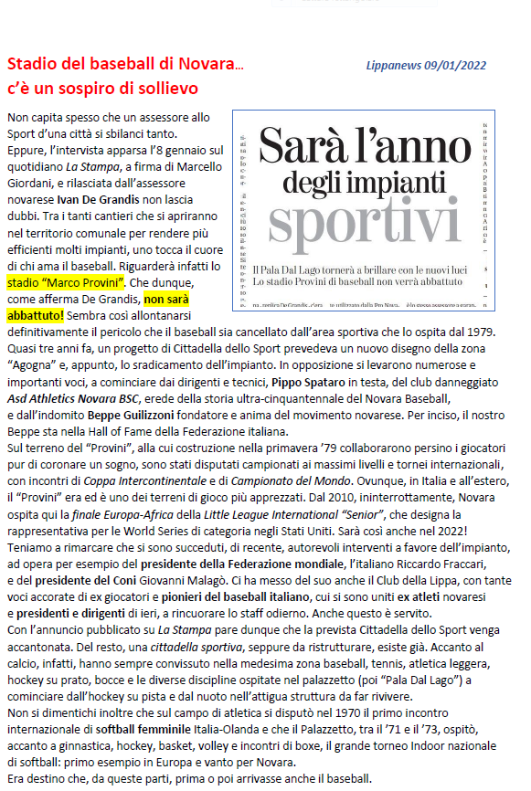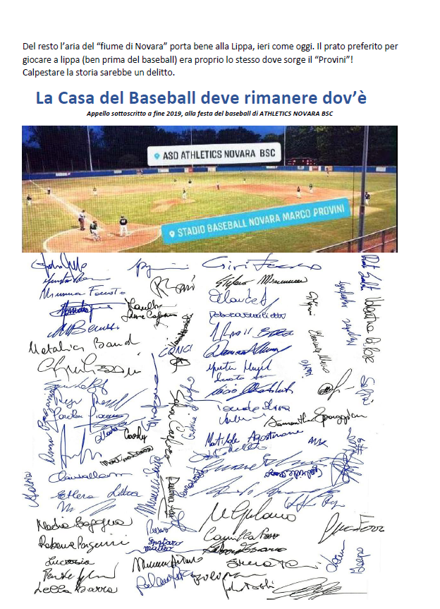 Pubblichiamo quanto scritto dai padri del baseball a Novara ,ai quali vanno i nostri ringraziamenti,con la speranza che finalmente si possa ripristinare il nostro magnifico impianto .