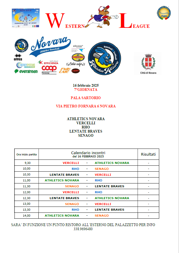I nostri ragazzi saranno impegnati nella 7° giornata del Campionato Western League ,con il Patrocinio del Comune di Novara la giornata sarà organizzata dalla nostra società Domenica 16 Febbraio al Pala Sartorio di Novara, ospiti della giornata i pari età di Vercelli,Rho,Senago e Lentate Braves ,appuntamento molto impegnativo per i “Leprotti “ché dovrà affrontare delle squadre sicuramente più esperte rispetto la nostra ricordandoci che nel roster Novarese ce una forte presenza di ragazzi del 2017 che sicuramente fa ben sperare per il prossimo futuro, a guidare i nostri ragazzi ci sarà Luis Mirabal ritornato dopo la sua assenza ieri mattina mettendosi subito al lavoro.