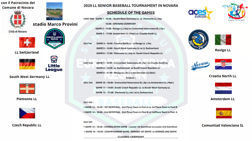 Questi saranno i paesi che verranno rappresentati dalle compagini presenti ,nota particolare alla squadra che rappresenterà il Piemonte in quanto rappresentante della regione che ospita l’evento e come detto in precedenza la Little League International ha indicato il nostro stadio e la nostra città come sede permanente della Finale EA categoria Seniores, riconoscimento prestigioso per tutta la nostra società che lavora duramente per dare il meglio a tutti i partecipanti al Torneo, soddisfazione particolare in casa Athletics dove saranno presenti tre rappresentanti della nostra società ANGELA RISPOLI Team Manager, FILIPPO SPATARO Manager e FRANCESCO GIUNTA players.
