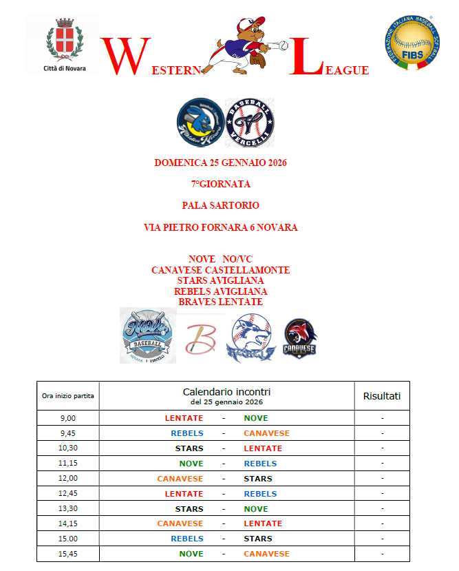 Ritorno in campo della nostra squadra che partecipa alla Western League ,il connubio con gli amici di Vercelli da vita a questa squadra che fino ad oggi ha dato grande soddisfazione ,con il Patrocinio del Comune di Novara la Western League farà tappa al Pala Sartorio di Novara Domenica 25 gennaio 2026 ,oltre alla nostra squadra ospiteremo le squadre di Avigliana Rebels e Stars la Canavese e i Braves di Lentate ,giornata importante dove i nostri ragazzi dovranno confermare quanto di buono fatto in questa edizione ,l’unione con i ragazzi del Vercelli ha elevato il tasso tecnico della squadra che insieme ai tecnici ci stanno dando molte soddisfazioni, sicuramente non sarà facile ma cercheremo di confermare la posizione della classifica certi che il lavoro fatto in palestra dai ragazzi fino ad oggi inizierà a dare i frutti sperati .